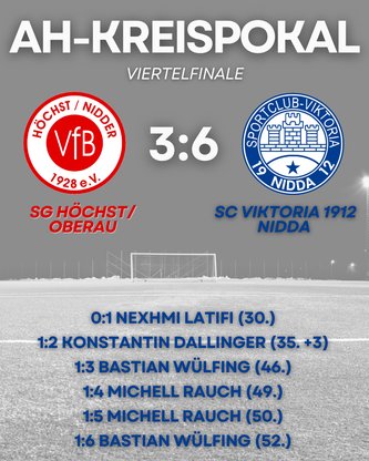 Im Pokal-Viertelfinale setzte sich unser Team mit 6:3 gegen die SG Höchst/Oberau durch. Nach einer halben Stunde brachte Nexhmi Latifi (30.) unser Team in Führung. Diese Führung konnten die Gäste in der Nachspielzeit ausgleichen. Ebenfalls noch in der Nachspiel war es Konstantin Dallinger, der für die erneute Führung der Viktoria sorgte.