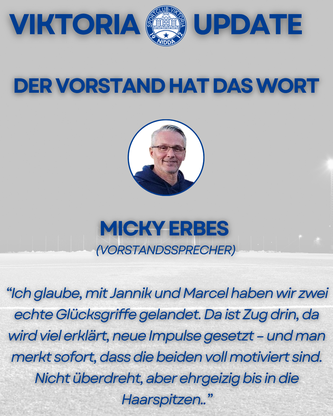 Fußball ist für mich nicht nur ein Sport, sondern eine echte Leidenschaft, die mich schon mein ganzes Leben begleitet. Ich möchte mithelfen, dass wir als Mannschaft und Verein unsere Ziele erreichen und uns stets weiterentwickeln. Gleichzeitig ist es mir wichtig, dabei bodenständig zu bleiben und ein gutes Miteinander zu pflegen. Der Teamgedanke steht für mich an oberster Stelle. Ich schätze den offenen, ehrlichen Austausch im Trainerteam, mit Spielern, Verantwortlichen, Ehrenamtlichen, Fans und Zuschauern. Ich freue mich darauf, viele Viktorianer in den nächsten Wochen persönlich kennenzulernen – sei es am Spielfeldrand, im Vereinsheim oder bei anderen Gelegenheiten.