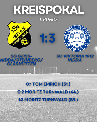 In der ersten Runde des Kreispokals konnte sich unser Team mit 3:1 bei der SG Geiß-Nidda/Steinberg/Glashütten durchsetzen. Bereits in der ersten Hälfte stellten Tom Emrich (31.) und Moritz Turnwald (44.) - jeweils nach Vorarbeit von Leutrim Jusufi - die Weichen auf Sieg.